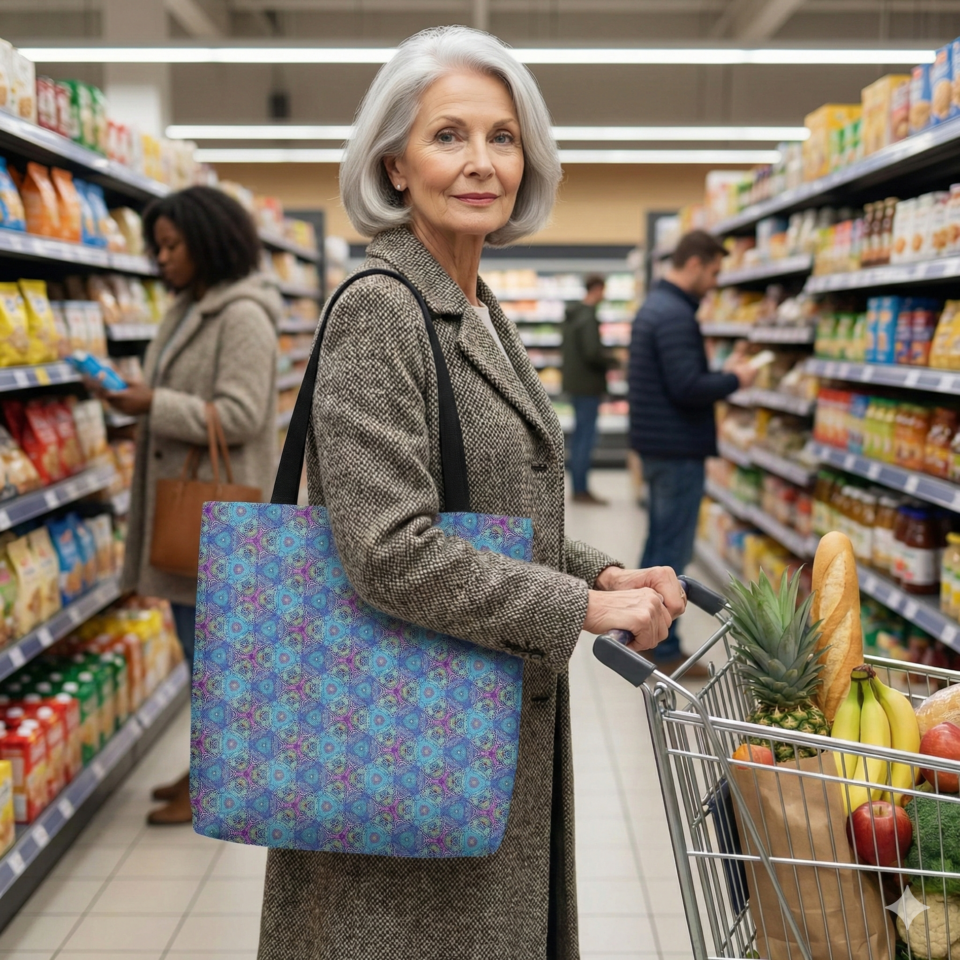 Carry your creative side around town with this vibrant patterned tote bag! Crafted from soft, resilient poly-poplin fabric and sporting a 1" black strap, you can hitch it up and be on your way. Plus, all edge stitching is double layered for twice the toughness. And, since it's machine-washable and has the same print on each side, you can look sharp all day.