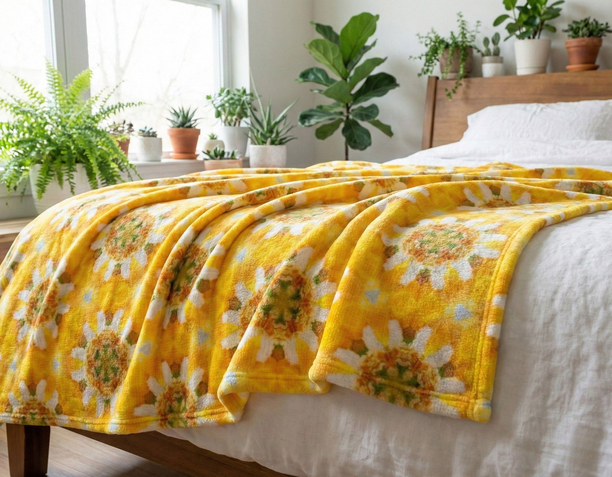 This whimsical design brings to mind sunny daisies a-bloom. Such a joyous pattern! Our ultra-cozy blankets come in two sizes and boast amazing artwork on top. The bottom side? White as snow. Both plush fleece and sherpa fleece options are 100% polyester, so you can't go wrong. For a foolproof choice, opt for a 60" x 80" plush fleece—it's luxurious on both sides, the artwork pops, and it's the perfect size for all.